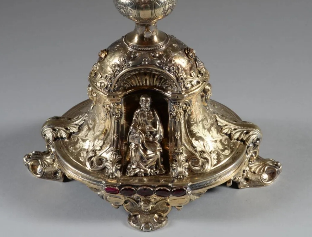 La base ovale à motifs de feuilles et d’enroulement accueille dans une niche un saint Pierre à l’avers et un saint Jean au revers, tous deux en ronde-bosse.
