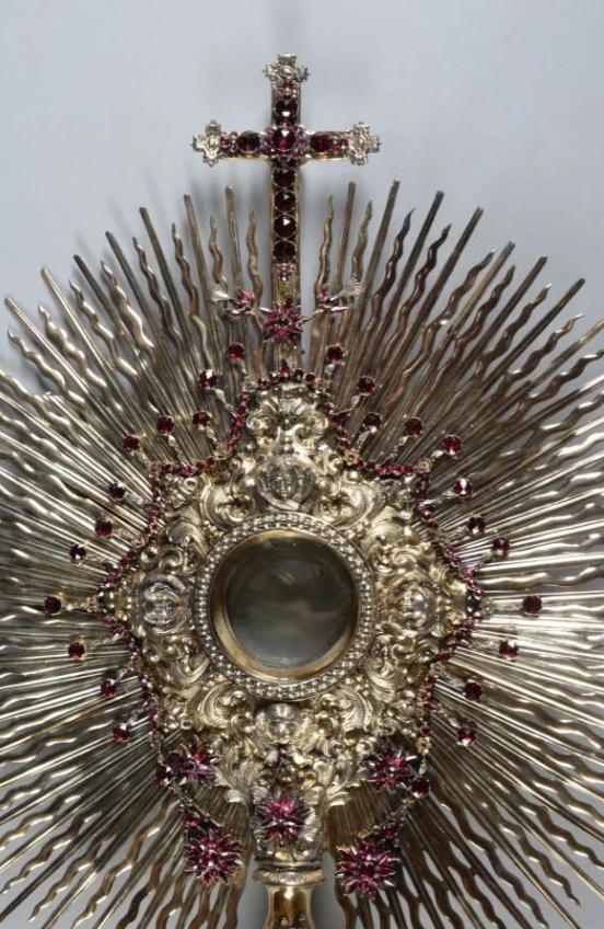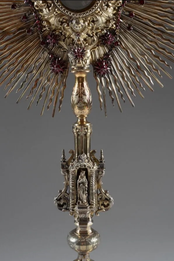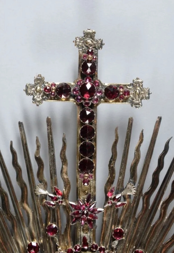 L’ostensoir, rayonnant, porte une lunette à quatre chérubins dans des feuilles d’acanthe à enroulements, le tout surmonté d’une croix aux extrémités à découpes de cuir. La lunette appliquée d’un collier serti de grenats de Perpignan agencé de façon à former des rayons, les étoiles de la parure autour du fût et à la base de la croix. Cette dernière, ainsi que la base, appliqués de grenats en semis.