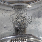 Les ciseaux sont décorés de filets, le plateau est à contours bordés de filets moulurés reposant sur quatre petits pieds à enroulements. La prise est en forme de coquille. Le revers de la mouchette et le fond du plateau sont gravés d’armoiries sous une couronne de comte (Les armoiries probablement regravées sur des armoiries primitives). Perpignan, probablement 1737-1738 – Maître-orfèvre : Jean-Baptiste NAVIER, reçu en 1712 L. (plateau) 21 – … Continuer la lecture →