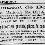 En 1883, la bijouterie Mourat déplace sa boutique et son atelier. Anciennement installé au 1 rue de l’Argenterie, angle de la rue des Trois journées, Le bijoutier Paul Mourat va s’installer rue Fontfroide et place Gretry, puis vers 1900, il sera positionné au 30 rue de l’Argenterie, angle rue du Théâtre. Annonce parue dans le journal Le Passe-Partout, le 09 septembre 1883.