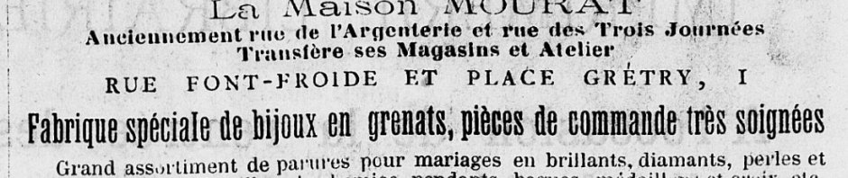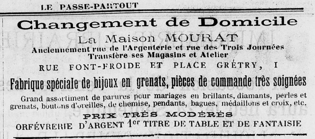 En 1883, la bijouterie Mourat déplace sa boutique et son atelier. Anciennement installé au 1 rue de l’Argenterie, angle de la rue des Trois journées, Le bijoutier Paul Mourat va s’installer rue Fontfroide et place Gretry, puis vers 1900, il sera positionné au 30 rue de l’Argenterie, angle rue du Théâtre.