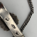 Chatelaine ou crochet à ciseaux en argent à décor d’une large coquille. Poinçons Fermiers Généraux ROUSSILLON XVIIIème. PERPIGNAN 1784-1790. Maître-orfèvre : Jean-Joachim GUCHENS reçu en 1782. Clavier complet avec ses chaines et de leurs crochets. Longueur : 65cm. Poids : 111g
